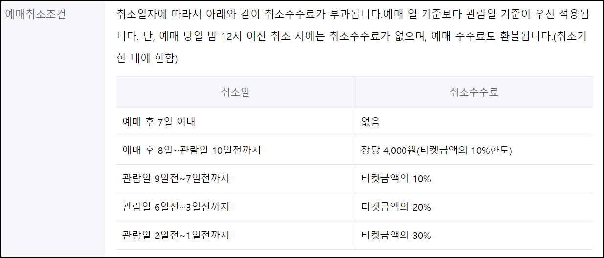 👉 예매 취소에 따른 수수료는 아래와 같습니다.